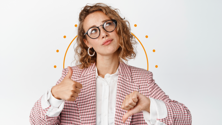 A woman with one thumb up and the other one down representing the do's and don'ts of translating marketing content
