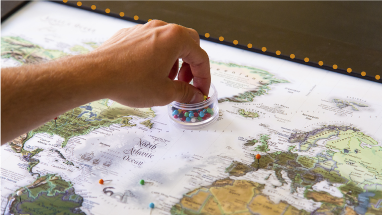 La foto de una persona marcando países en un mapamundi representando la expansión internacional de una página web
