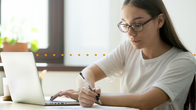 Una mujer con una computadora portátil y un bolígrafo, elaborando pautas de traducción
