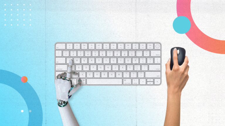 Un brazo robótico escribiendo en un teclado junto a una mano humana que sujeta un ratón de ordenador, representando la traducción automática frente a la traducción IA.